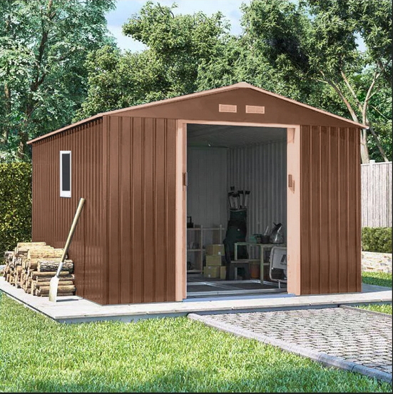 Vrtna kućica 2,77 x 3,19m orah smeđa boja sa prozorom za alat i opremu od čvrstog pocinčanog čelika i otporna na korodiranje i stroge vremenske uvjete. Dvoje klizna vrata za jednostavan ulaz i visina 2m, moguće zaključati i ventilacija sa obe strane. Montira se na betonski temelj. Plaćanja pouzećem ili s karticom, dostava je 39€. Upute